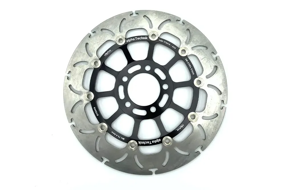 Die alpha Technik Bremsscheibe ABD33 im markanten Omega-Design bietet höchste Performance und Zuverlässigkeit im Straßen- und Renneinsatz. Entwickelt aus der Erfahrung im professionellen Motorsport, überzeugt sie durch präzise Verarbeitung, optimierte Wärmeableitung und einen konstanten Reibwert. Die Kombination aus CNC-gefrästem Aluminium-Innenring (schwarz eloxiert) und einem speziell geschliffenen Stahl-Außenring sorgt für optimale Stabilität und gleichmäßige Bremsleistung bei jeder Geschwindigkeit.