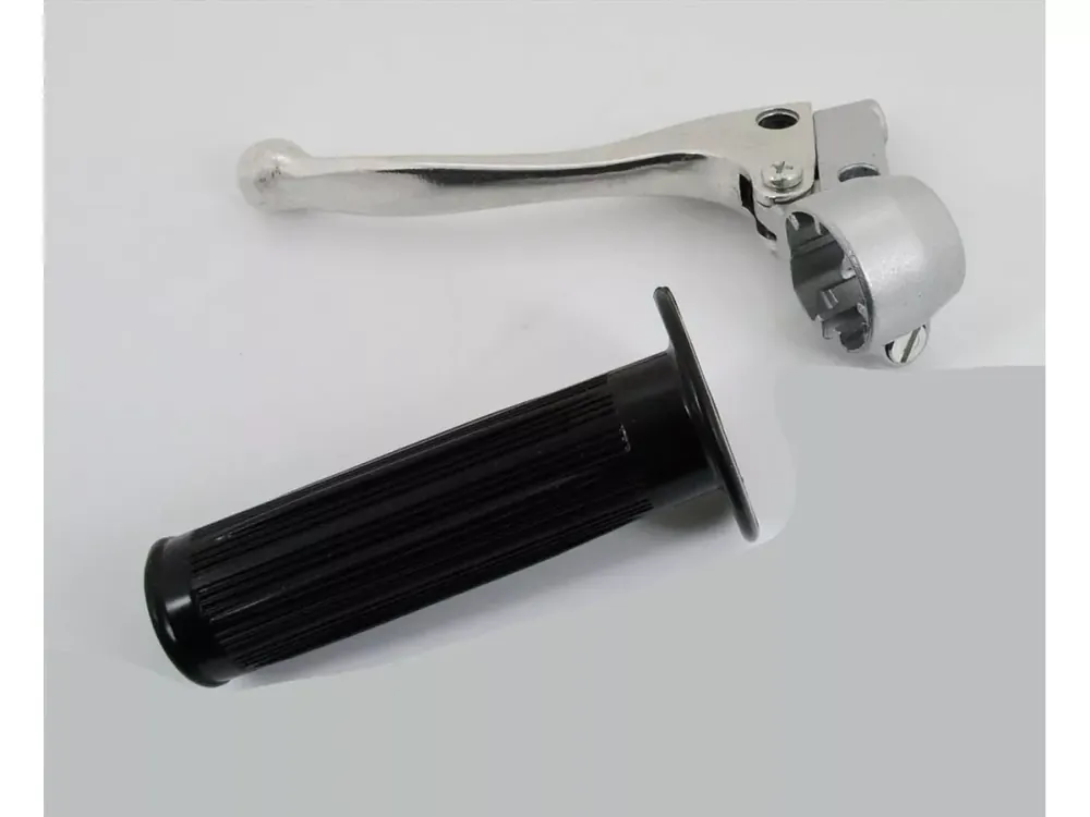 Festgriff Armatur mit schwarzem Rillen Griffgummi und Voll Aluminium Kupplungs Hebel Version, passend für Zündapp, Kreidler, Hercules, Puch, DKW, KTM Mofa, Moped, Mokick. Geeignet für 22mm Lenker, Griffbreite ca. 105mm, Armaturbreite ca. 26mm. Ausgestattet mit 8mm Spiegelöffnung ohne Gewinde für Bowdenzugstell Schraube. 2. Wahl mit Lackfehlern.