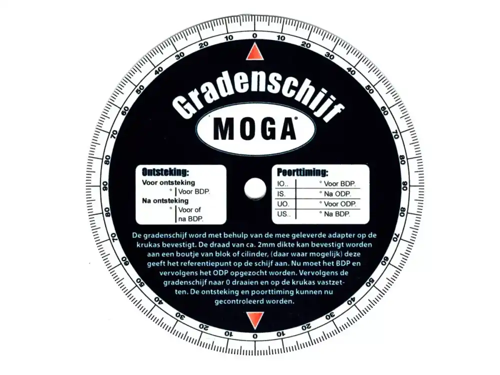 MOGA Gradscheibe mit Niederländischer Aufschrift, Ø 120mm, Bohrung 6mm, aus Kunsstoff, 0,80mm stark, für Zündungseinstellung bei 2-Takt und Steuerzeiten bei 4-Takt Motoren. Passend für Zündapp, Kreidler, Hercules, Puch, Miele, DKW, KTM, Rixe Mofas, Mopeds, Mokicks mit Bosch, Ducati, Motoplat, Noris Zündungen. Unverzichtbar für Zweitakt Tuning. Made in Germany. Adapter für Schwungmasse mit M22 x 1,5 oder M26 x 1,5 Gewinde benötigt. Draht als Hilfsmittel zur Bestimmung des obersten Totpunkts empfohlen. Mit Abkürzungen für BDP, ODP, IO, IS, UO, US auf der Scheibe.