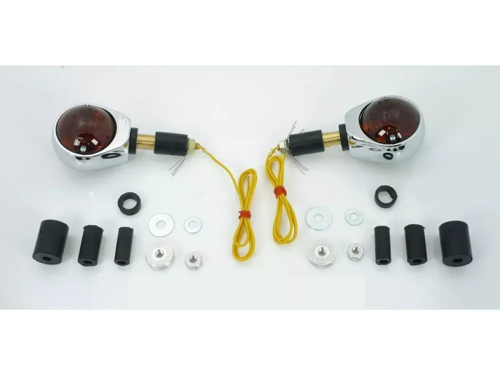 Chrom Ochsenaugen Blinker mit getönten Gläsern und E-Prüfzeichen, Tüv eintragungsfrei. Befestigungsmaterial passt für Lenker von 11-22mm, inkl. Harley Zoll Lenker. Lieferumfang enthält Halogenbirnen, 12V und 21W. Passend für Harley, Chopper, Motorrad Streetfighter, Oldtimer, Classic Umbau.