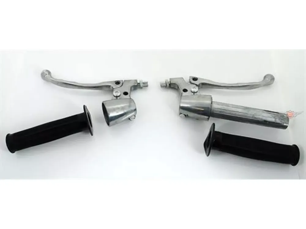 Gasgriff mit Kupplungsarmatur Satz im Torpedo Design, komplett mit Griffgummis und Hebel. Passend für Kreidler Florett, Hercules K 50, Zündapp KS GTS, Puch, DKW RT, KTM Comet Mokick und Kleinkraftrad. Ohne Schalter oder Schalteraufnahme. Gaszugführung und Zug müssen angefertigt werden.