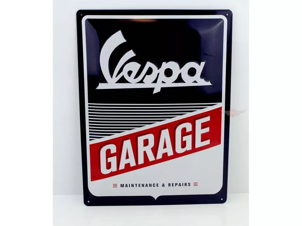 Blechschild „Vespa Garage“, Metall, Top Qualität, H: 395mm, B: 295mm, kräftige Farben, geprägt, hergestellt in Deutschland, passend für Vespa-Liebhaber.