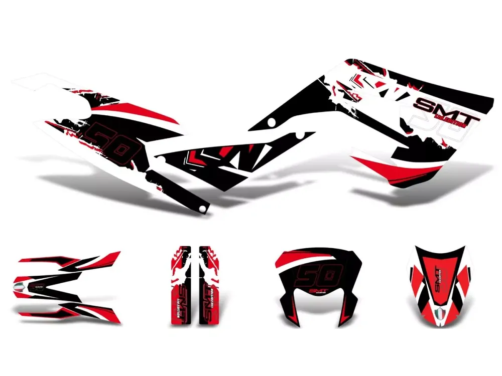 Absolut präzise geschnittenes Dekor in Schwarz-Weiß-Rot matt. Made in Germany. Passend für Gilera SMT 50 ab 2018.
