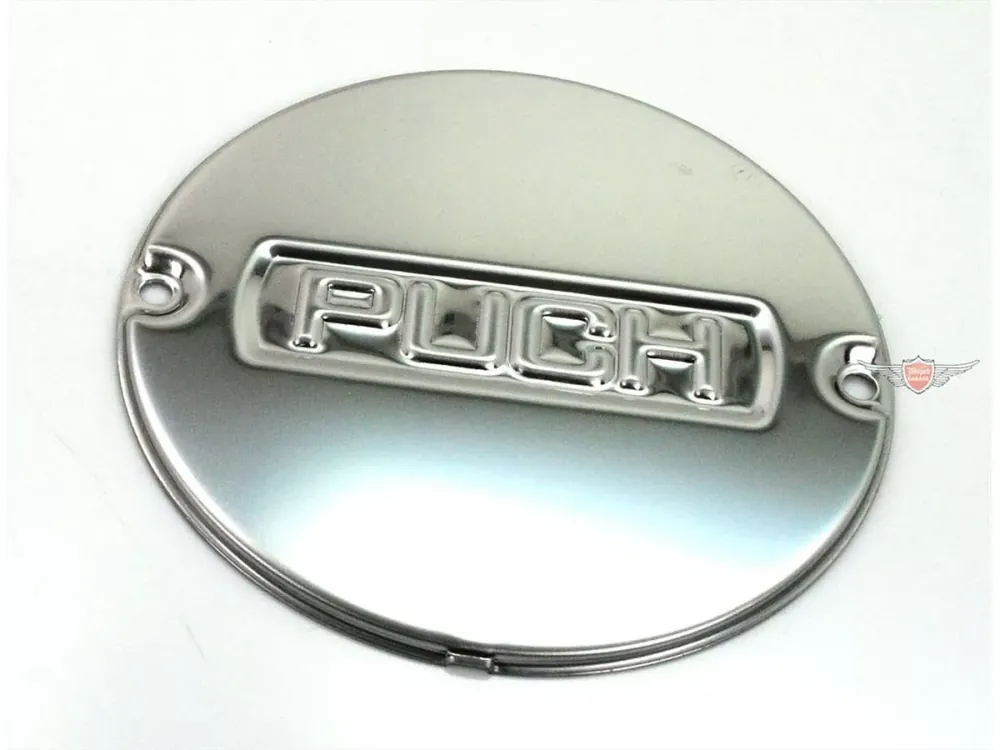 Verchromter Polraddeckel mit eingeprägtem Puch Schriftzug passend für Puch Monza und andere Mofas.