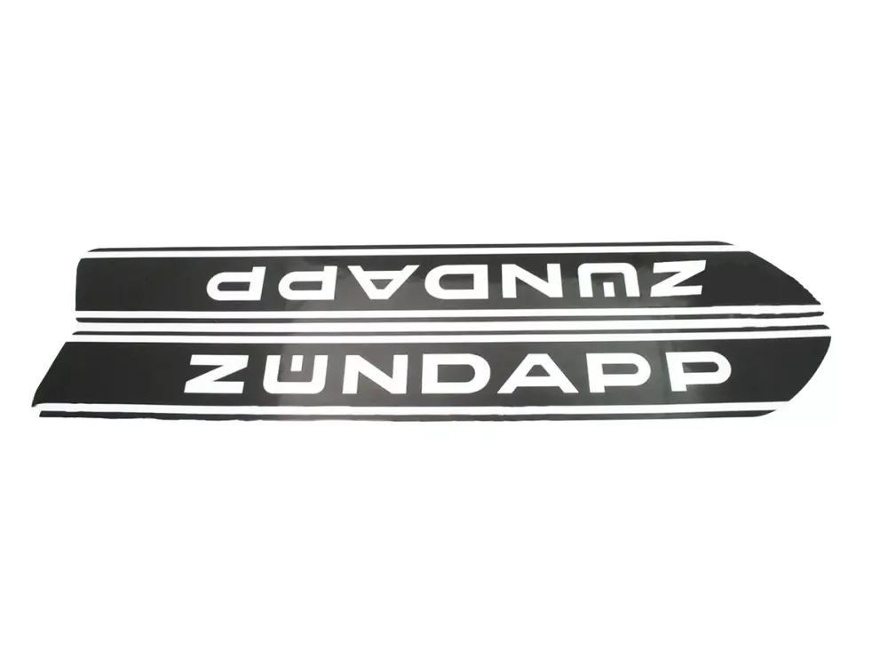 2-teiliger Satz Tankaufkleber mit Zündapp-Schriftzug in Schwarz/Weiß. Nicht Benzinbeständig.