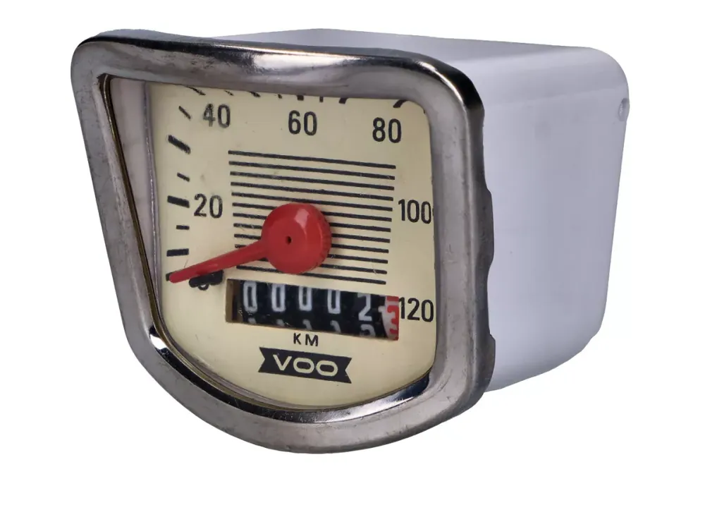 Mechanischer Trapez Tacho mit weißer Tachoscheibe / Zifferblatt und Anzeige bis 120km/h mit Kilometer-Zähler.