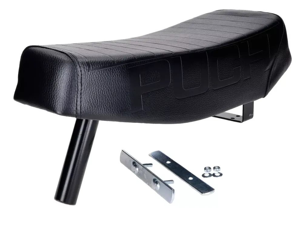Lange Sitzbank für zwei Personen mit 30mm Klemmung und hinterer Abstützung. Passend für Puch Maxi. Die Buddyseat-Sitzbank ist mit schwarzem Kunstleder bezogen, mit gestanztem Puch-Schriftzug an den Seiten und weißem Maxi Schiftzug auf der Rückseite. Nicht mit hinterem Gepäckträger kombinierbar.