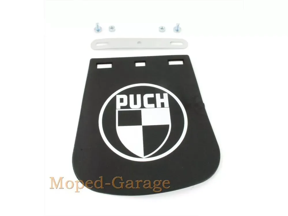 Spritzlappen mit Puch Emblem passend für Zündapp Mofa, Moped, Mokick. Schrift kann verwischt sein, siehe Bilder. Maße: Breite oben ca. 120mm, Höhe ca. 165mm, Befestigungslochabstand ca. 85 bis 95mm.