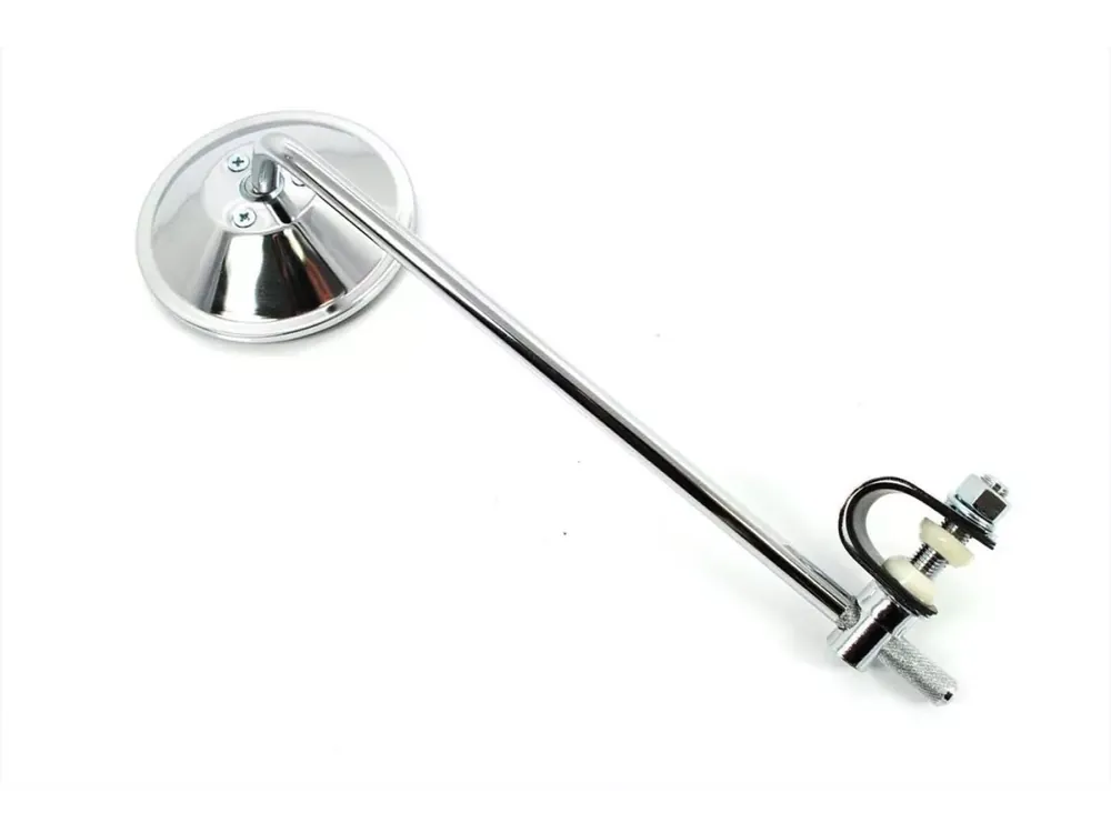 Spiegel mit Schelle zur Lenkerbefestigung, geeignet für Links oder Rechts, universell passend für viele Mofas und Mopeds der 50er bis 80er Jahre, wie z.B. Zündapp, Kreidler, Hercules, Miele, DKW, NSU, Horex, Puch, Gritzner. Glas verkleinernd, Maße: Spiegelkopf ca. 100mm, Stange ca. 260mm, Schelle passend für alle 22mm Lenker.